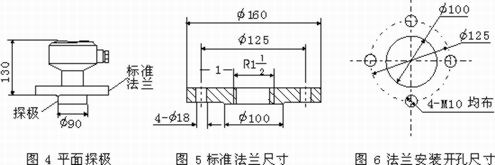 3、平面探极为法兰安装(法兰安装开孔尺寸见图